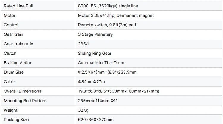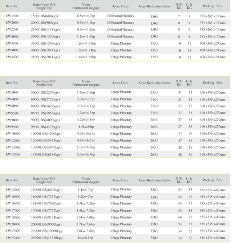 1. Он оснащен двигателем с обмоткой серии 12/24 В, обеспечивает сильное натяжение и высокую линейную скорость и отвечает требованиям различных тяжелых условий эксплуатации.